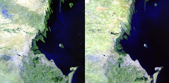 Left: August 21, 1985. Right: August 29, 2011. The Caspian Sea is the world’s largest landlocked body of water, and it’s getting bigger. In the past couple of decades, heavy rains in the greater Volga Basin have greatly increased the incoming flow from the Volga River, the Caspian’s primary source of water. These images show a small portion of the shoreline. In the 2011 image, coastal settlements have been flooded, displacing inhabitants and shutting down industrial facilities.